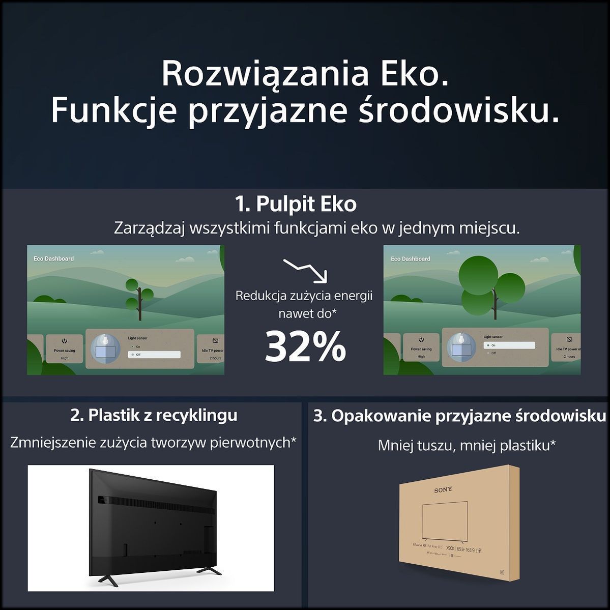 Меню містить Easy Eco Set-up, яке проведе вас через усі параметри, Auto Power Saving Mode15(функція BRAVIA CAM12,13, який затемнює зображення, коли ви не перед екраном), Енергозбереження для зменшення яскравості та енергоспоживання за потреби, Датчик світла для налаштування яскравості відповідно до кількості світла в кімнаті та Вимкнення живлення телевізора в режимі очікування, що вмикає телевізор вимикається через визначений час бездіяльності.
