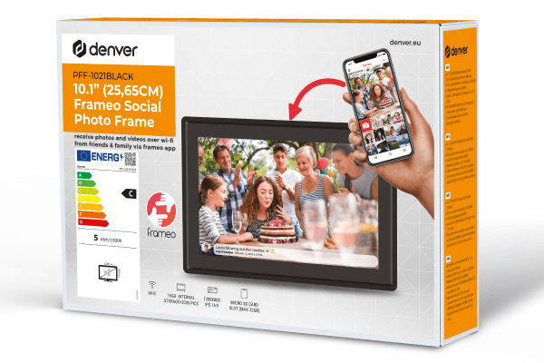 Підключайтеся до світу та діліться спогадами за допомогою вбудованого Wi-Fi (2,4 ГГц). Denver Frameo PFF-1021B дозволяє легко надсилати фотографії з будь-якої точки світу безпосередньо на вашу раму – все, що вам потрібно, це доступ до Інтернету. Ви можете миттєво ділитися останніми моментами з родиною та друзями незалежно від відстані.