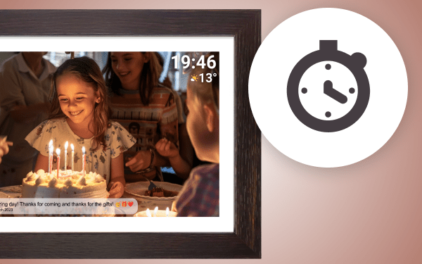 Функція таймера дозволяє вибрати час, коли окремі фотографії на слайдах змінюються. Лише кількома клацаннями миші ви можете вибрати інтервали від 10 секунд до 30 хвилин, налаштувавши спосіб перегляду своїх спогадів за допомогою Denver Frameo PFF-1543DW.