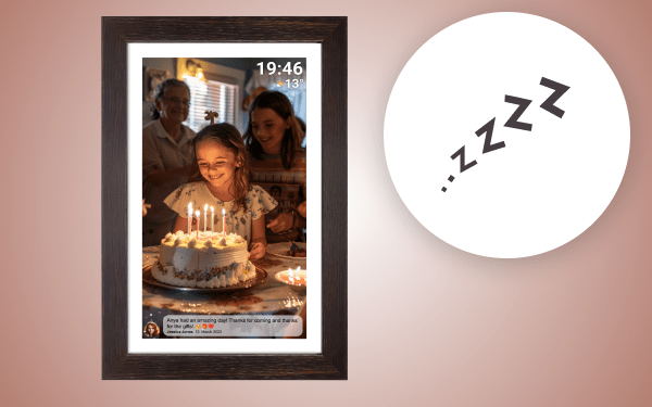 Рамка пропонує сплячий режим, який вимикає екран, щоб зменшити споживання енергії. За замовчуванням екран вимикається о 23:00 і вмикається знову о 7:00. Щоб змінити цей параметр, просто встановіть час початку/завершення режиму сну. Рамка не вимкнеться та не перейде в режим очікування, тому ви все ще зможете отримувати фотографії в режимі сну.