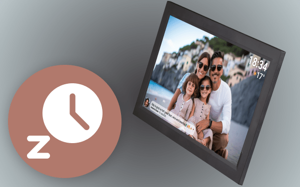 Рамка пропонує сплячий режим, який вимикає екран, щоб зменшити споживання енергії. За замовчуванням екран вимикається о 23:00 і вмикається знову о 7:00. Щоб змінити цей параметр, просто встановіть час початку/завершення режиму сну. Рамка не вимкнеться та не перейде в режим очікування, тому ви все ще зможете отримувати фотографії в режимі сну.