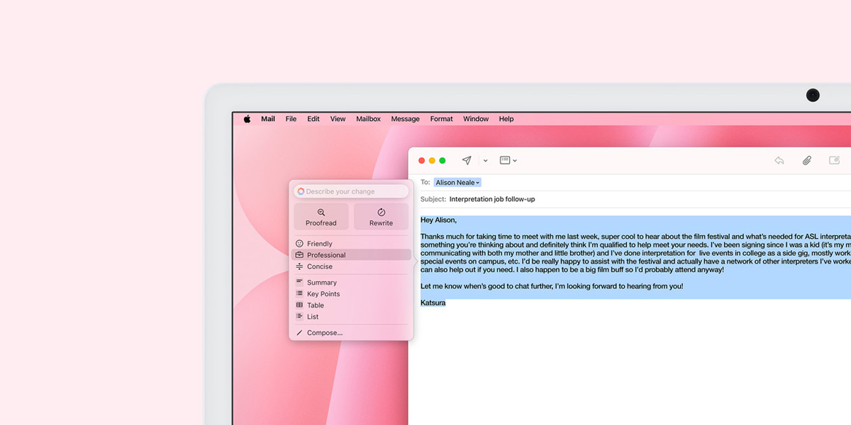 Apple Intelligence2 це ваш особистий помічник зі штучним інтелектом, який спрощує написання, творче самовираження та організацію. Розширений захист захищає вашу конфіденційність – навіть Apple не може отримати доступ до ваших даних. Інтелектуальні функції стилістичної корекції та швидке конспектування тексту економлять час і покращують якість вашого написання. Крім того, інтуїтивно зрозумілий пошук фотографій і відео на природній мові в програмі «Фотографії» полегшує пошук потрібних файлів. Це ідеальний інструмент для тих, хто цінує конфіденційність і ефективність.