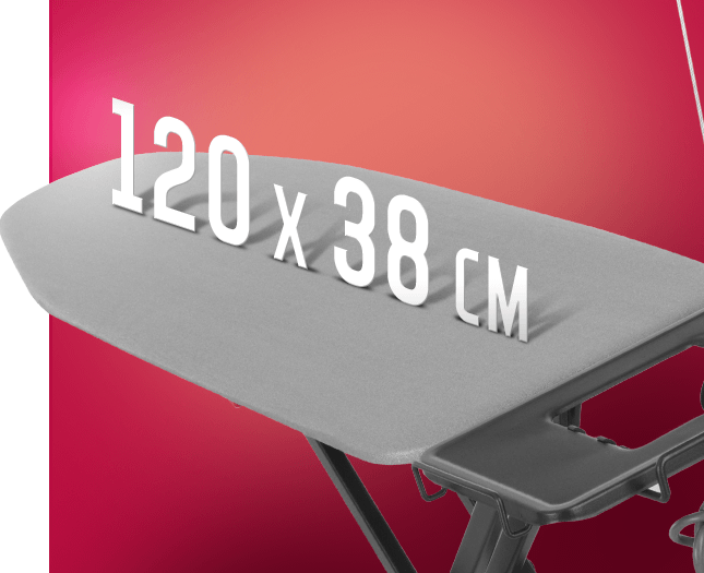 Верхня частина дошки розміром 120х38 см виготовлена з натягнутої металевої сітки, що забезпечує більшу паропроникність, що призводить до значно кращих результатів роботи. Прасування ще ніколи не було таким простим!
