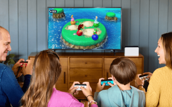 При бажанні ви можете грати з друзями на консолі Nintendo без телевізора – у настільному режимі. Зручно розташуйте консоль на підставці та відрегулюйте її під кутом, який підходить гравцям. Ви можете поділитися екраном і контролерами та насолоджуватися розважальною грою для кількох гравців.