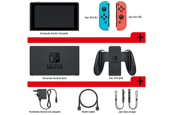 Консоль Nintendo Switch, 2 контролери Joy-Con, док-станція, 2 браслети Joy-Con, ручка Joy-Con, адаптер змінного струму, кабель HDMI