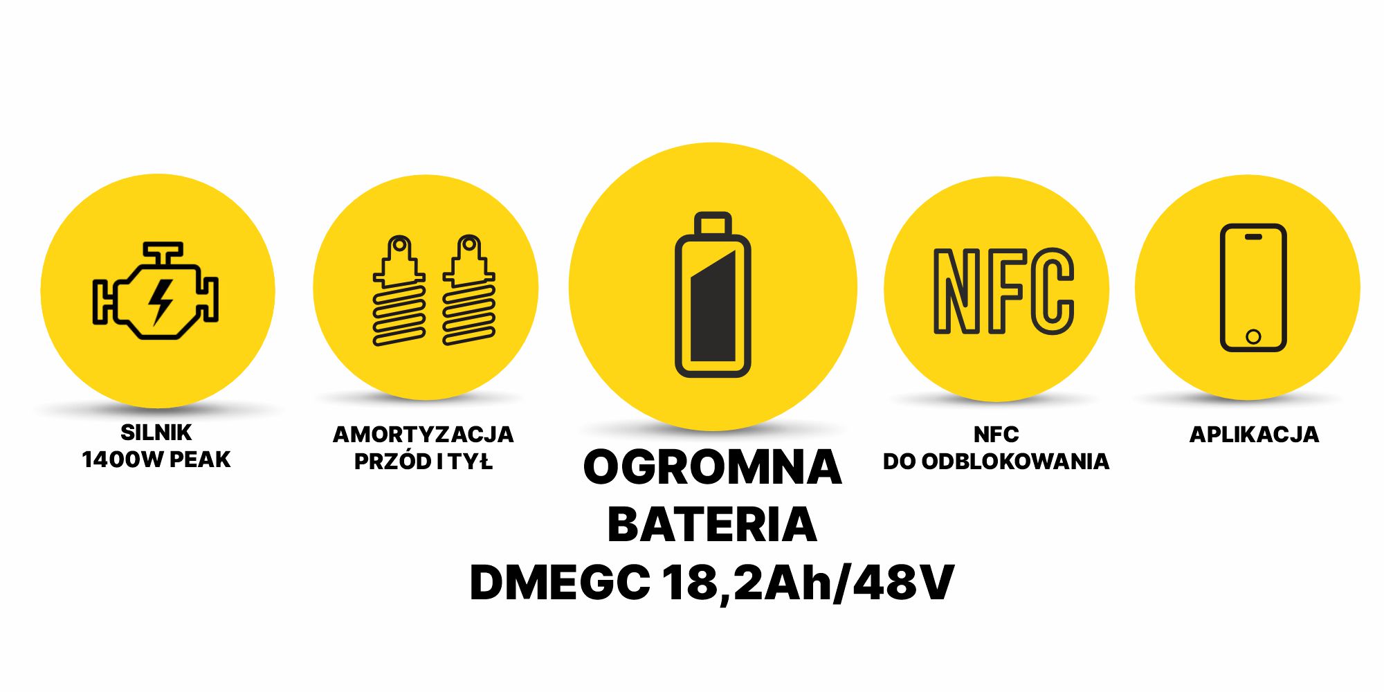 Акумулятор ємністю 18,2 А·год, 48 В заснований на твердих батареях від відомої компанії DMEGC, що гарантує не тільки значну ємність, але й надійність. Він має активний балансир, який ефективно контролює рівномірний знос окремих елементів, що забезпечує збереження стабільності та досягнення великої дальності до 85 км*.