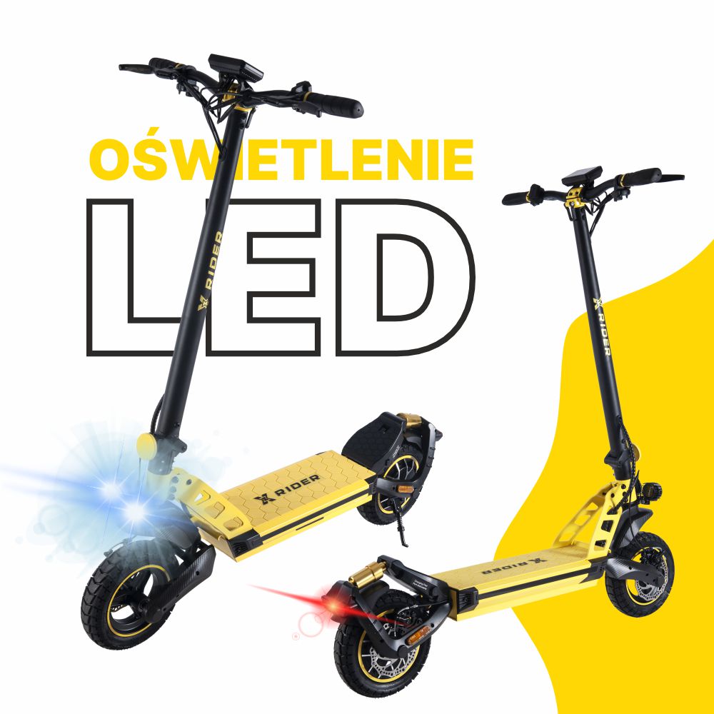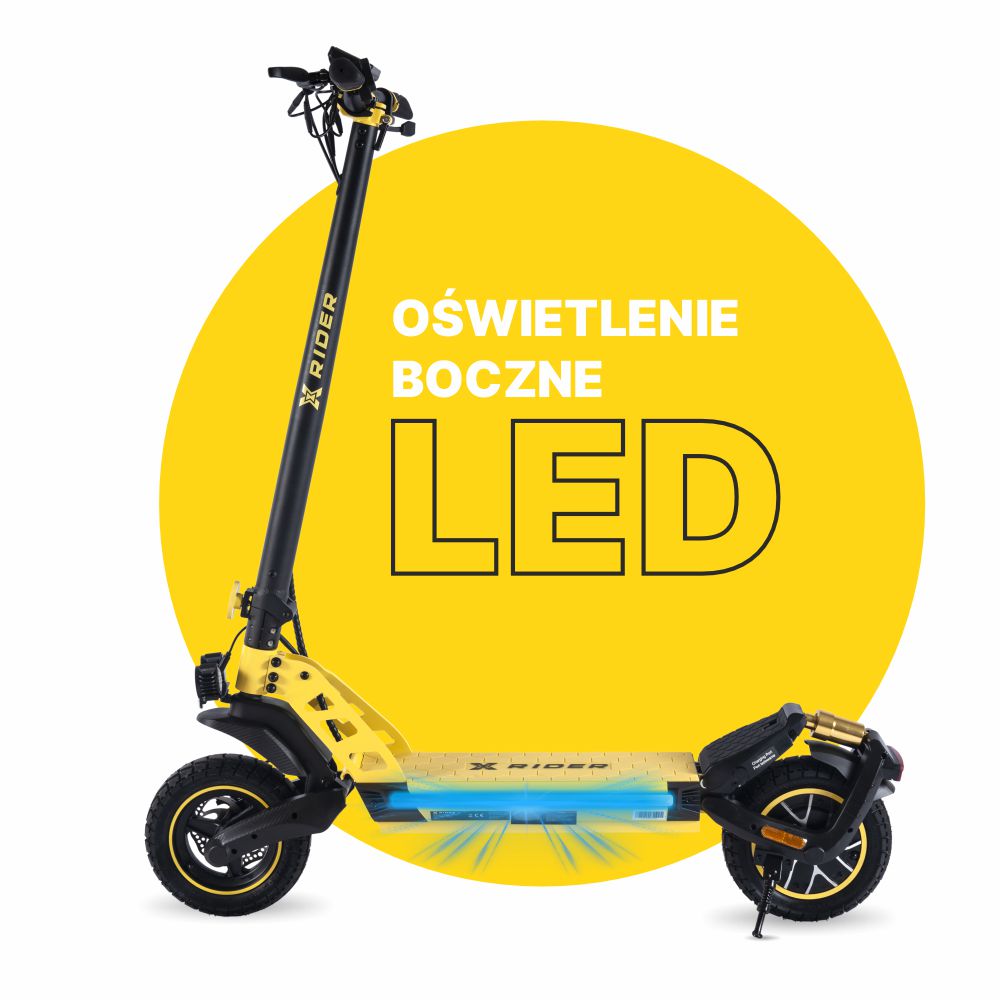 Палуба, підсвічена блакитними світлодіодними бічними ліхтарями, є не тільки стильним елементом, але й практичним рішенням, яке покращує видимість користувача в темний час доби. Завдяки світлодіодним діодам, розміщеним з боків, дека стає не тільки візуально привабливою, але й підвищує безпеку за рахунок збільшення видимості скутера та користувача.